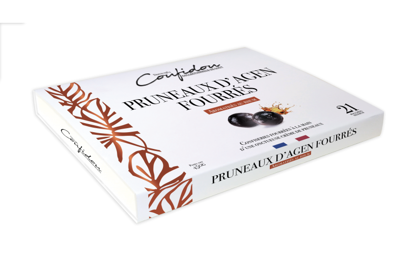Fruits de toutes les attentions, dénoyautés aux ciseaux puis délicatement fourrés à la main d'une savoureuse crème de pruneaux aromatisée au Rhum.